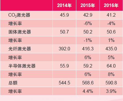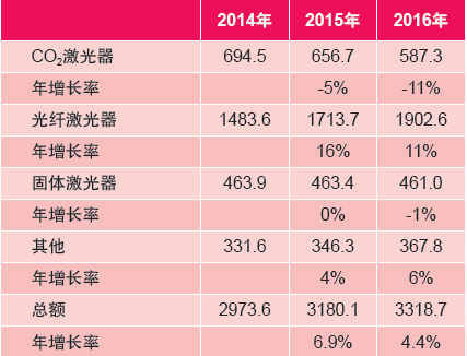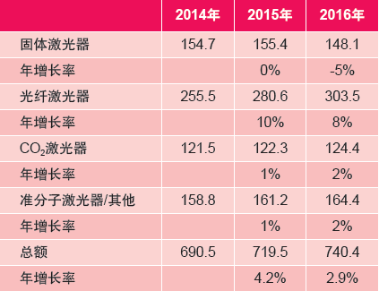 表1:工業激光器市場的銷售收入(貨幣單位:百萬美元)
