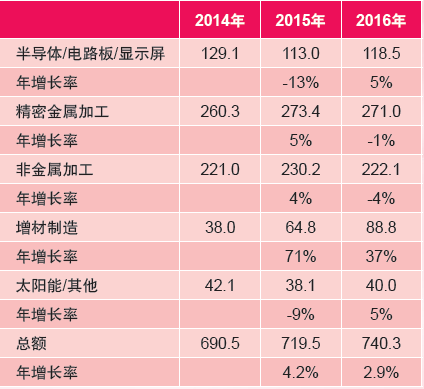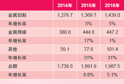 在表2中,材料加工市場的優勢非常明顯,有59%的總銷售收入要歸功于用于材料加工的平均功率大于1kW的激光器。這個應用領域繼續以每年9%的速度在增長。微加工(占總銷售收入的23%)主要是使用功率小于1 kW的激光器,繼續以4%的速度在增長。打標/雕刻類別(占18%)——工業激光市場中唯一的“消費產品”領域,其增長非常穩定,雖然并不那么引人注目(4%)。2015年,三個加工類別都在增長。從業內的預測來看,2016年很有可能繼續重演2015年的表現,上半年溫和增長,下半年將會更好。