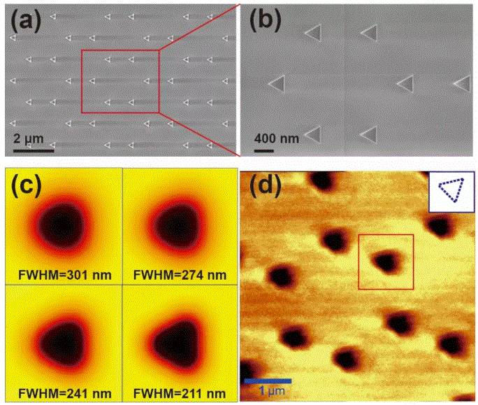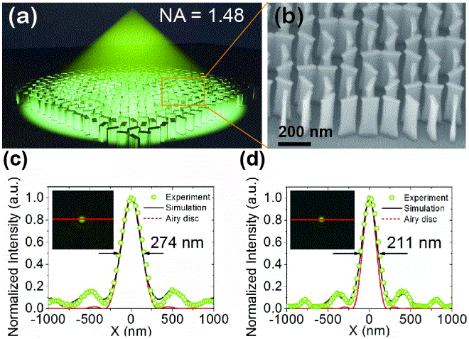 圖1. (a) 超高數(shù)值孔徑超構(gòu)光學(xué)透鏡示意圖;(b) 高縱橫比微納結(jié)構(gòu)SEM圖;(c) 空氣中(NA = 0.98)聚焦光斑半峰全寬;(d) 油浸條件下(NA=1.48)聚焦光斑半峰全寬