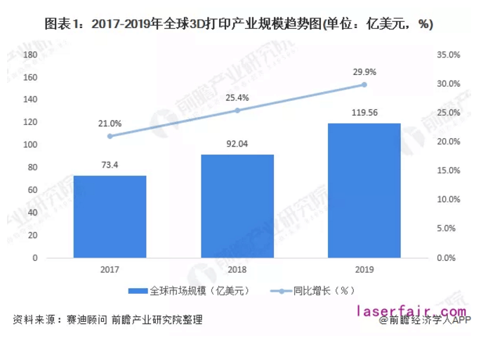 為解決疫情防控中應(yīng)急物資短缺的難題,美國(guó)、意大利等國(guó)紛紛利用3D打印機(jī)生產(chǎn)呼吸機(jī)配件、個(gè)人防護(hù)面罩,甚至還創(chuàng)建了在線論壇,用于政府、醫(yī)院、非政府組織發(fā)布需求,以及業(yè)內(nèi)人士分享經(jīng)驗(yàn)等。3D打印在全球疫情防控中發(fā)揮的作用,反映出這項(xiàng)技術(shù)普及度的提高和應(yīng)用領(lǐng)域的擴(kuò)展。全球3D打印市場(chǎng)規(guī)模破百億美元3D打印技術(shù)最早可以追溯到1976年噴墨打印機(jī)的發(fā)明。20世紀(jì)80年代以后,3D打印行業(yè)受到國(guó)內(nèi)外的廣泛關(guān)注,各種3D打印技術(shù)也在多個(gè)行業(yè)應(yīng)用并發(fā)展。目前已覆蓋了制造、醫(yī)療、教育、航空航天、軍事等多個(gè)領(lǐng)域。根據(jù)2020年3月賽迪顧問(wèn)發(fā)布的《2019年全球及中國(guó)3D打印行業(yè)數(shù)據(jù)》,2019年,全球3D打印產(chǎn)業(yè)規(guī)模達(dá)119.56億美元,增長(zhǎng)率為29.9%,同比增長(zhǎng)增加4.5%。