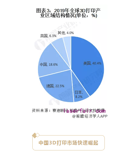 2019年美國(guó)產(chǎn)業(yè)規(guī)模占全球比重40.4%,德國(guó)僅次于美國(guó),中國(guó)位居第三。作為3D打印起步較晚的中國(guó),近幾年,抓緊自主創(chuàng)新和研發(fā),雖然和國(guó)外的技術(shù)還有一定差距,但也一步步朝著精細(xì)化和專業(yè)發(fā)展。當(dāng)然,國(guó)內(nèi)巨大的市場(chǎng)潛能,也吸引了不少國(guó)外3D打印行業(yè)巨頭的目光和投資,進(jìn)一步推動(dòng)了中國(guó)3D打印產(chǎn)業(yè)的發(fā)展。