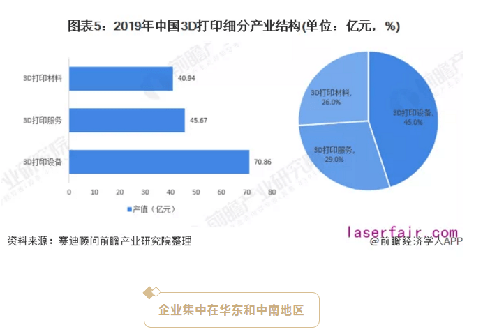 2019年,中國(guó)3D打印設(shè)備產(chǎn)業(yè)規(guī)模70.86億元,占比最高,達(dá)到45%;3D打印服務(wù)產(chǎn)業(yè)規(guī)模45.67億元,占比29%;3D打印材料產(chǎn)業(yè)規(guī)模40.94億元,占比26%。
