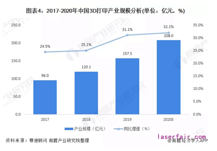 近年來(lái),我國(guó)3D打印市場(chǎng)應(yīng)用程度不斷深化,在航空航天汽車、船舶、核工業(yè)、模具等領(lǐng)域均得到了越來(lái)越廣泛的應(yīng)用。3D打印技術(shù)已經(jīng)成為航空航天等領(lǐng)域直接制造機(jī)修復(fù)再制造的重要技術(shù)手段。在汽車、船舶、核工業(yè)、模具等領(lǐng)域成為產(chǎn)品設(shè)計(jì)、快速原型制造的重要實(shí)現(xiàn)方式。2017-2020年,我國(guó)3D打印產(chǎn)業(yè)規(guī)模逐年增加,增加速度要略快于全球整體增速,以致于我國(guó)3D產(chǎn)業(yè)占全球的比重在不斷增加。根據(jù)2020年3月賽迪顧問(wèn)發(fā)布的《2019年全球及中國(guó)3D打印行業(yè)數(shù)據(jù)》,2019年,中國(guó)3D打印產(chǎn)業(yè)規(guī)模為157.5億元,較上年增加31.1%。