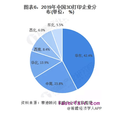 2019年,華東地區(qū)為中國(guó)3D打印企業(yè)主要聚集區(qū)域,占據(jù)全國(guó)42.4%。中南、華北、西南等地區(qū)也有優(yōu)秀企業(yè)集聚,分別占據(jù)23.8%、13.9%和8.4%的企業(yè)資源。華東地區(qū)的3D打印知名企業(yè)包括湖南華曙高科技有限責(zé)任公司、杭州先臨三維科技股份有限公司、上海光韻達(dá)三維科技有限公司、上海曼恒數(shù)字技術(shù)有限公司;中南地區(qū)的3D打印知名企業(yè)包括深圳市光華偉業(yè)實(shí)業(yè)有限公司、湖北嘉一三維高科股份有限公司等。