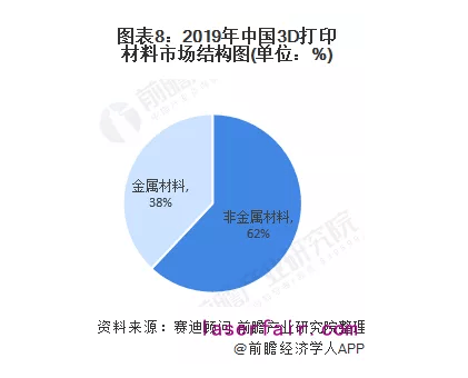 2019年,中國(guó)3D打印材料產(chǎn)業(yè)結(jié)構(gòu)中,非金屬材料產(chǎn)業(yè)規(guī)模25.38億元,占比最高,達(dá)到62%;金屬材料產(chǎn)業(yè)規(guī)模15.56億元,占比38%。