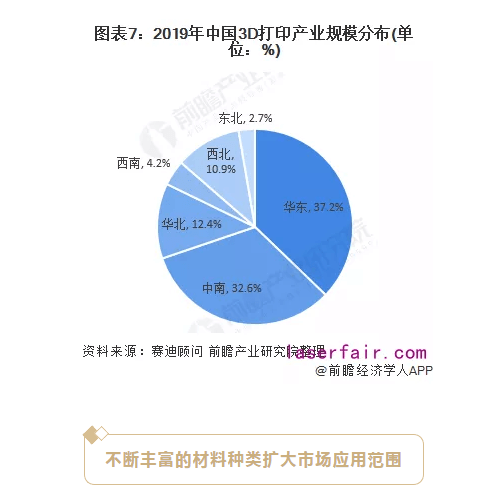 2019年,中南和華東地區(qū)由于3D打印設(shè)備與服務(wù)能力突出,產(chǎn)業(yè)規(guī)模分布位居全國(guó)第一、第二,分別占比37.2%和32.6%。華北地區(qū)則由于3D打印材料和服務(wù)能力突出,產(chǎn)業(yè)規(guī)模位居全國(guó)三位,占比12.4%。