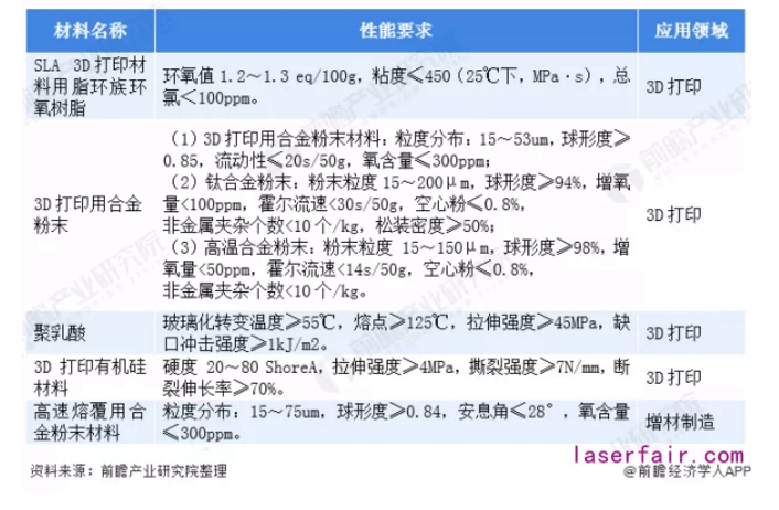 2019年12月,工業(yè)和信息化部關(guān)于印發(fā)《重點(diǎn)新材料首批次應(yīng)用示范指導(dǎo)目錄(2019年版)》,其中公布了6項(xiàng)與3D打印相關(guān)的重點(diǎn)新材料,分別為SLA 3D打印材料用脂環(huán)族環(huán)氧樹脂、3D打印用合金粉末、聚乳酸、3D打印有機(jī)硅材料和高速熔覆用合金粉末材料。