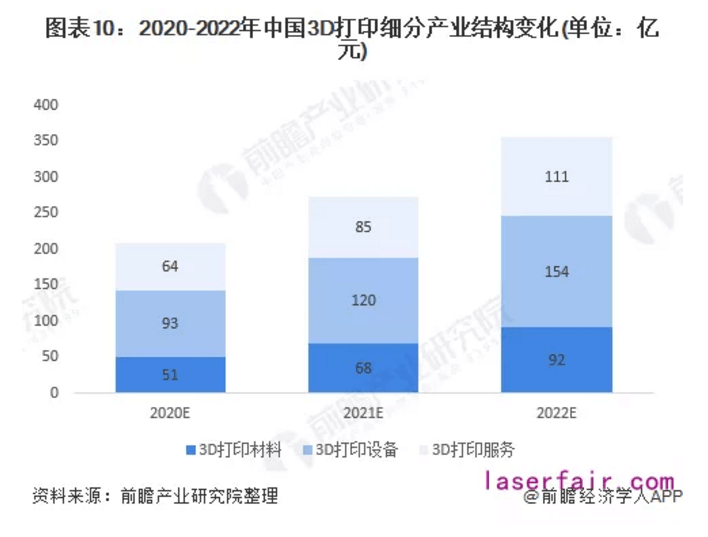 預(yù)計(jì)2020-2022年,3D打印設(shè)備依舊占據(jù)最大份額,占比逐年小幅下降,2022年,產(chǎn)業(yè)規(guī)模為154億元,占比達(dá)到43%。3D打印服務(wù)占比上漲,2022年,產(chǎn)業(yè)規(guī)模為111億元,占比為31%。3D打印材料未來(lái)三年占比保持穩(wěn)定,2022年,產(chǎn)業(yè)規(guī)模為92億元,占比26%。