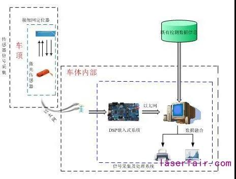 接觸網(wǎng)檢測車動態(tài)桿號測試系統(tǒng)由接觸網(wǎng)定位器,激光傳感器,以太網(wǎng),工業(yè)計算機(jī),DSP嵌入式系統(tǒng),以及監(jiān)視器和相應(yīng)數(shù)據(jù)采集處理軟件組成。系統(tǒng)結(jié)構(gòu)圖如圖1所示。通過在車頂兩側(cè)垂直向上各安裝一臺二維激光傳感器,激光傳感器對準(zhǔn)接觸網(wǎng)定位器,通過二維激光傳感器實時對定位器進(jìn)行掃描,激光傳感器將掃描得到桿號信息,通過以太網(wǎng)傳輸接口將信息傳送到嵌入式處理系統(tǒng),進(jìn)行數(shù)據(jù)分析和處理,通過嵌入式處理系統(tǒng)處理后形成所需桿號信息,最后再通過以太網(wǎng)接口將最終有用信息送往上位機(jī)供檢測系統(tǒng)使用,進(jìn)而對檢測數(shù)據(jù)進(jìn)行一一定位。