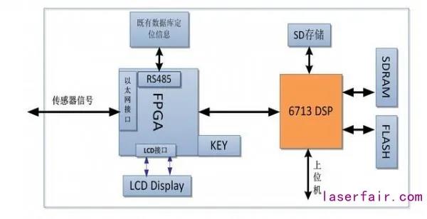 通過FPGA實現(xiàn)信號的預(yù)處理,送至DSP實現(xiàn)信號的再處理標(biāo)定出當(dāng)前桿號信息,通過LCD液晶顯示模塊進(jìn)行實時顯示。另外,還需要將重要的數(shù)據(jù)存入SD卡存儲系統(tǒng)中。,通過以太網(wǎng)接口實現(xiàn)與上位機(jī)進(jìn)行通信,進(jìn)行數(shù)據(jù)融合。如圖3所示: