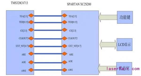 嵌入式系統(tǒng)采用先進(jìn)的DSP+FPGA架構(gòu),使用TI公司的TMS320C6713,最高運算速度達(dá)到1350MIPS,SPARTAN XC2S200板載20萬門FPGA ,系統(tǒng)最高時鐘頻率為200M,2M Bytes 大容量FLASH,AM29LV1605,4M*16 bit SDRAM,MT48LC4M16A2,100M 工作時鐘,最高工作頻率143MHz。保證了足夠的系統(tǒng)資源。適用于高速實時檢測的需要。FPGA與DSP采用EMIF接口進(jìn)行通訊,F(xiàn)PGA/DSP通信電路如圖4所示: