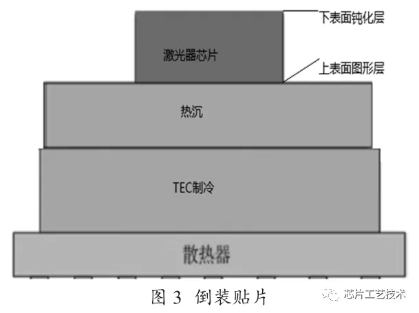 圖 3 為倒裝貼片圖。倒裝貼片封裝仍采用 TEC 方式,傳統(tǒng)的貼激光器芯片和熱沉貼片方式采取芯片正面朝上, 背面冷卻面和熱沉通過(guò)焊料相連接, 但芯片有源區(qū)發(fā)熱量主要是集中在上表面幾個(gè)微米的區(qū)域發(fā)熱, 上表面和下表面的一般有上百微米的距離,熱量通過(guò)這么長(zhǎng)距離的傳導(dǎo)到熱沉,再到TEC 制冷,散熱效果有限。