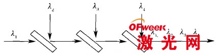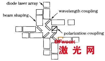 為了提高半導(dǎo)體激光器的功率,在不增加快軸方向光斑尺寸的情況下,采用了多波長(zhǎng)禍合技術(shù)。本系統(tǒng)由808nm,915nm,940nm,980nm 4個(gè)波長(zhǎng)組成。經(jīng)過(guò)波長(zhǎng)鍋合單元,可使功率密度提高3倍。波長(zhǎng)藕合原理如圖7所示。