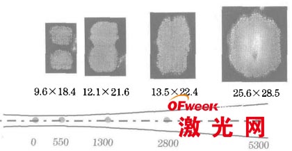 激光器光束質(zhì)量測(cè)量采用在不同距離上測(cè)量光斑大小,計(jì)算其發(fā)散角,最后得出光參數(shù)積的方法。圖9是光束傳輸?shù)讲煌嚯x時(shí)用相紙得到的光斑情況(單位:mm)。