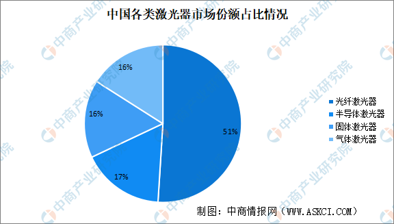 激光器的性能決定著激光設(shè)備輸出光束的質(zhì)量和功率,是下游激光設(shè)備最核心的部件之一。根據(jù)增益介質(zhì)的不同,激光器可分為光纖激光器、半導(dǎo)體激光器、固體激光器和氣體激光器。其中,光纖激光器因高效率、多用途、低維護(hù)成本的特點(diǎn)受到下游客戶的青睞。在應(yīng)用領(lǐng)域,光纖激光器已成為最大的激光器品類,市場份額超過一半。光纖激光器主要應(yīng)用在工業(yè)領(lǐng)域,而醫(yī)學(xué)領(lǐng)域主要還是以半導(dǎo)體、固體及氣體激光為主,三者合計(jì)占比49%。