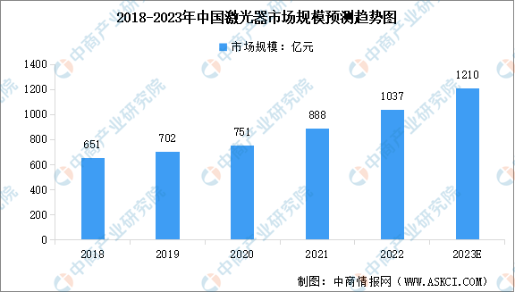 激光器市場規(guī)模增長,并在醫(yī)學(xué)領(lǐng)域扮演著重要角色隨著現(xiàn)代制造業(yè)朝著自動化、智能化的方向發(fā)展,5G商業(yè)化應(yīng)用程度不斷加深,半導(dǎo)體及光學(xué)、顯示和消費(fèi)電子等行業(yè)都處于持續(xù)增長狀態(tài),激光設(shè)備的需求持續(xù)增加,進(jìn)而帶動著激光器行業(yè)快速發(fā)展。中商產(chǎn)業(yè)研究院發(fā)布的《2023-2029年中國激光器市場前景及投資機(jī)會研究報(bào)告》顯示,2022年中國激光器市場規(guī)模達(dá)到1037億元,同比增長16.78%。中商產(chǎn)業(yè)研究院分析師預(yù)測,2023年中國激光器市場規(guī)模增至1210億元。