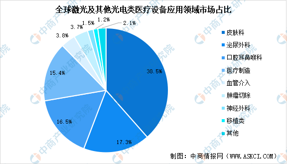 在醫(yī)療領(lǐng)域中,激光及其他光電類醫(yī)療器械逐漸普及,已廣泛運(yùn)用于眼科(如近視矯正、視網(wǎng)膜修補(bǔ)等)、外科(激光手術(shù)刀)、內(nèi)科、婦科、耳鼻喉科、心血管科、皮膚科等多個領(lǐng)域。2021年,全球激光及其他光電類醫(yī)療設(shè)備應(yīng)用市場中,皮膚治療類應(yīng)用依然是占比最大的領(lǐng)域,占比約為38.5%;其次是泌尿外科、口腔耳鼻喉科和醫(yī)療制造領(lǐng)域,占比分別為17.3%、16.5%和15.4%;隨后是血管介入治療、腫瘤切除、神經(jīng)外科手術(shù)領(lǐng)域,占比分別為3.8%、3.7%和 1.5%。