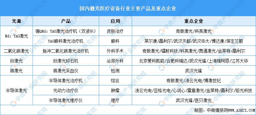 激光醫(yī)療設(shè)備國產(chǎn)化率提升,資本市場表現(xiàn)活躍目前國內(nèi)約有上百家激光醫(yī)療器械企業(yè),按綜合競爭力可分為兩大梯隊(duì)。其中,第一梯隊(duì)以外資企業(yè)和國內(nèi)少數(shù)優(yōu)勢企業(yè)為主,代表性廠商有以色列飛頓(Alma)、奇致激光、科醫(yī)人(Lumenis)和賽諾秀(Cynosure)、歐洲之星(Fotona)、賽諾龍(Syneron)、半島醫(yī)療、深圳吉斯迪、吉林科英等。第二梯隊(duì)以國內(nèi)若干小型制造企業(yè)為代表,這類企業(yè)普遍起步較晚,技術(shù)積累較少,受制于醫(yī)療器械行業(yè)本身的高門檻,其產(chǎn)品很難進(jìn)入被外資和本土優(yōu)勢企業(yè)包圍的醫(yī)院等中高端市場。從國產(chǎn)化率來看,在各類激光治療設(shè)備中,氣體激光器、Nd:YAG激光器等技術(shù)較為成熟的產(chǎn)品已經(jīng)實(shí)現(xiàn)了國產(chǎn)化,而高功率半導(dǎo)體激光醫(yī)療設(shè)備研制則相對匱乏,關(guān)鍵產(chǎn)品仍需依賴進(jìn)口。目前,已經(jīng)批量上市的國產(chǎn)醫(yī)療激光設(shè)備產(chǎn)品及典型企業(yè)如下表所示: