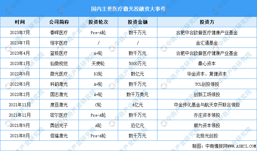 近年來,激光醫(yī)療企業(yè)在資本市場的表現(xiàn)活躍。2023年7月,春暉醫(yī)療宣布完成數(shù)千萬元人民幣的Pre-A輪融資,本輪融資由合肥中合歐普醫(yī)療健康產(chǎn)業(yè)基金領(lǐng)投,友博資本的成員企業(yè)上海展臣揚(yáng)帆新材料有限公司聯(lián)合投資。2023年4月,藍(lán)極醫(yī)療完成由合肥中合歐普醫(yī)療健康產(chǎn)業(yè)基金領(lǐng)投、陜投成長基金參與的數(shù)千萬元A+輪融資,募集資金將用于藍(lán)激光微創(chuàng)、光動力診療一體化設(shè)備,光生物調(diào)節(jié)等系列創(chuàng)新產(chǎn)品的研發(fā)、臨床研究等。